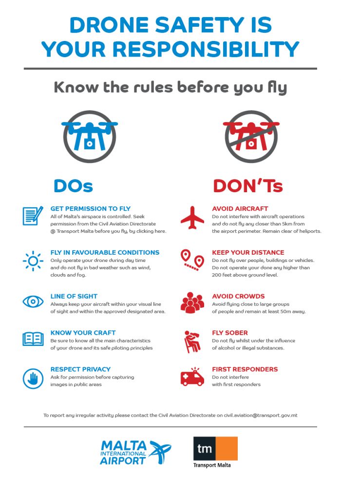 Irregular drone activity can be reported via email to the Civil Aviation Directorate on civil.aviation@transport.gov.mt